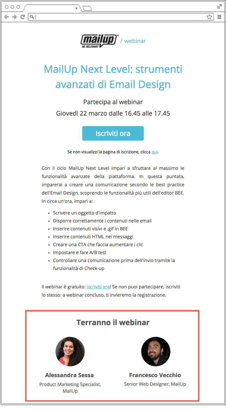 - Un invito a un webinar che mostri i volti e dettagli il job title di chi terrà la sessione
