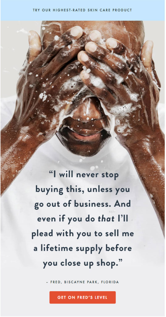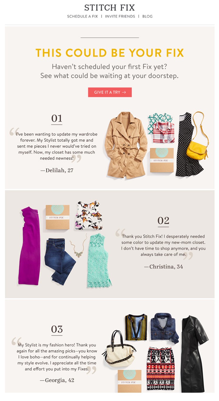 … Ma unire il nome proprio della persona che l’ha lasciata (e, se hai l’autorizzazione, anche il cognome, la città o altre informazioni pertinenti) lascerà sicuramente un segno diverso. Stitch Fix, in questo esempio, utilizza nome ed età per rendere più reale l’immagine di chi ha lasciato la recensione email.