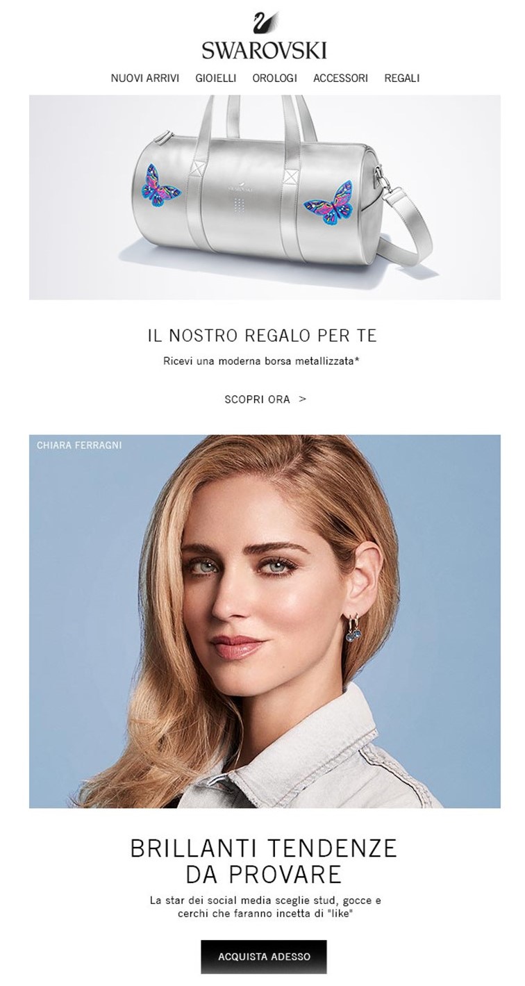 Molti brand scelgono di utilizzare dei testimonial influenti, in grado di spostare l’opinione di grandi masse di consumatori, e di utilizzare l’immagine di tali VIP non solo nelle campagne pubblicitarie propriamente dette, ma anche nelle campagne email. Così fa Swarovski nel messaggio qui sotto.