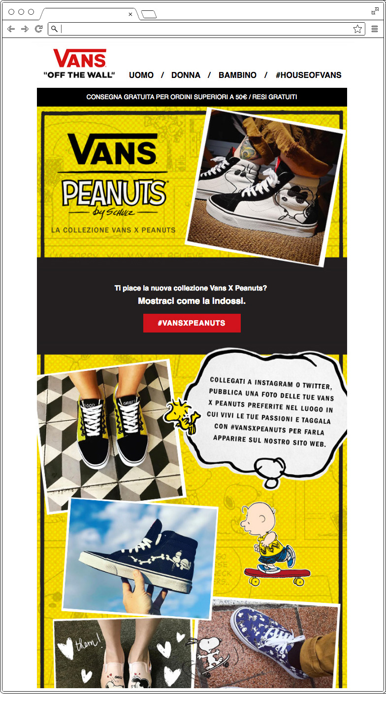 Bene anche inserire nell’email delle indicazioni puntuali su come utilizzare l’hashtag, su quali piattaforme social, e quali prodotti fotografare. Così fa Vans in questa email, che pubblicizza l’operazione #vans4peanuts.