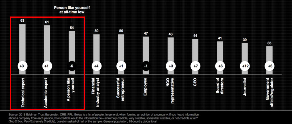 Trovare quindi dei testimonial della bontà del proprio prodotto è quindi essenziale. Eppure le recensioni non sono tutte uguali: ne abbiamo parlato qui, distinguendo le diverse tipologie di influencer. Riassumendo: più ci è vicina (emotivamente e a livello di immedesimazione) la persona che raccomanda, maggiore è il potere della raccomandazione. Come mostra il Trust Barometer 2018 di Edelman, siamo naturalmente più portati a fidarci molto di chi è come noi e di esperti tecnici/accademici, e meno di quanto ci dicono aziende e governi.