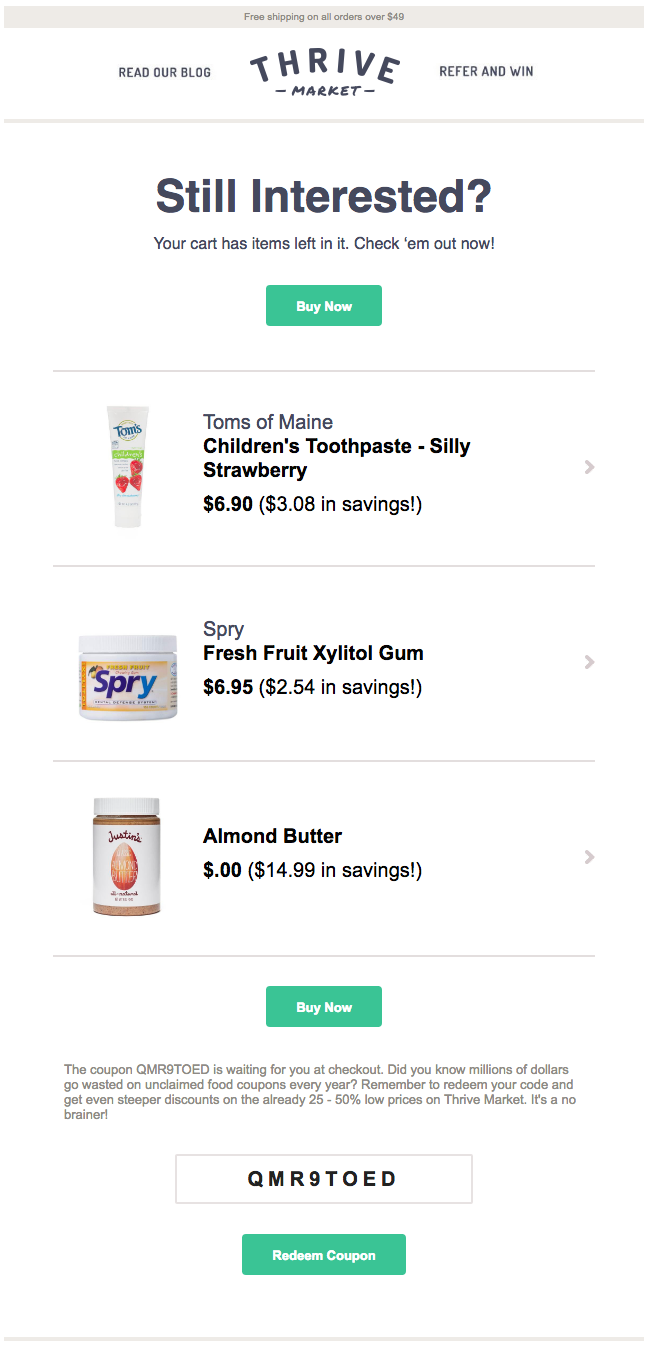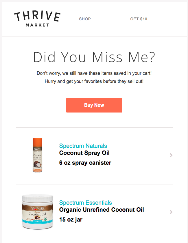 Il design è pulito e funzionale, in grado di presentare al meglio i prodotti, mettendo in risalto il doppio bottone di call to action che ben si intona al resto della comunicazione. In chiusura, il codice coupon enfatizza la convenienza e incoraggia la conversione, ben sapendo che il 54% dei consumatori acquisterà i prodotti abbandonati nel carrello se gli verranno offerti a un minor prezzo.