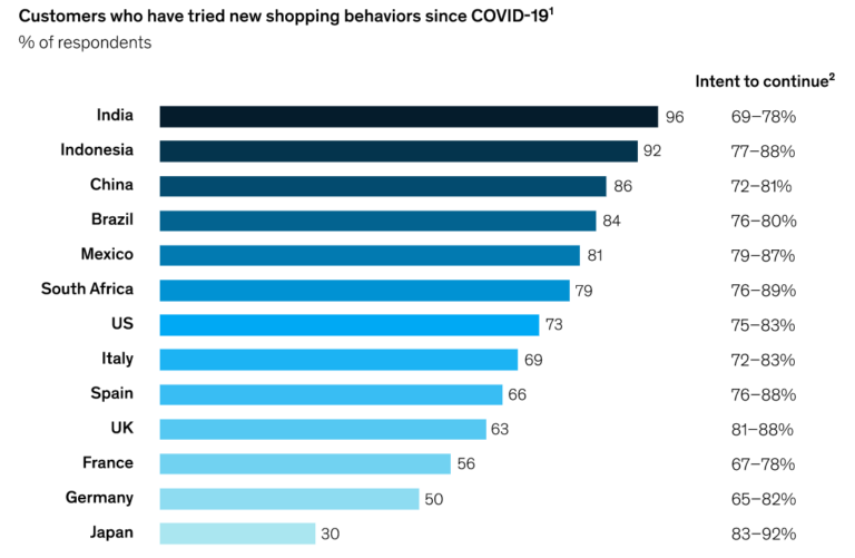 Molte persone si sono trovate a conoscere e apprezzare tutti i vantaggi dell’esperienza online e non sono disposte ad abbandonare questa nuova abitudine anche nel futuro post-Covid: stando ai dati, il 72-83% dei consumatori italiani intende portare avanti tali cambiamenti nella nuova normalità: