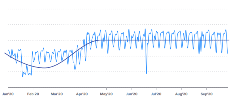 - aumento dei volumi di invio delle email, con un’impennata che ha raggiunto livelli mai visti prima. Confrontando i dati di invio relativi a un campione di clienti di MailUp, è stato registrato un aumento del 12% di invii tra gennaio e giugno 2020 rispetto allo stesso periodo del 2019 e, in alcuni casi, si è arrivati a quintuplicare il numero di email inviate in un giorno. Il picco di volumi è rimasto coerente anche nei mesi successivi alla prima quarantena, come mostra il grafico: