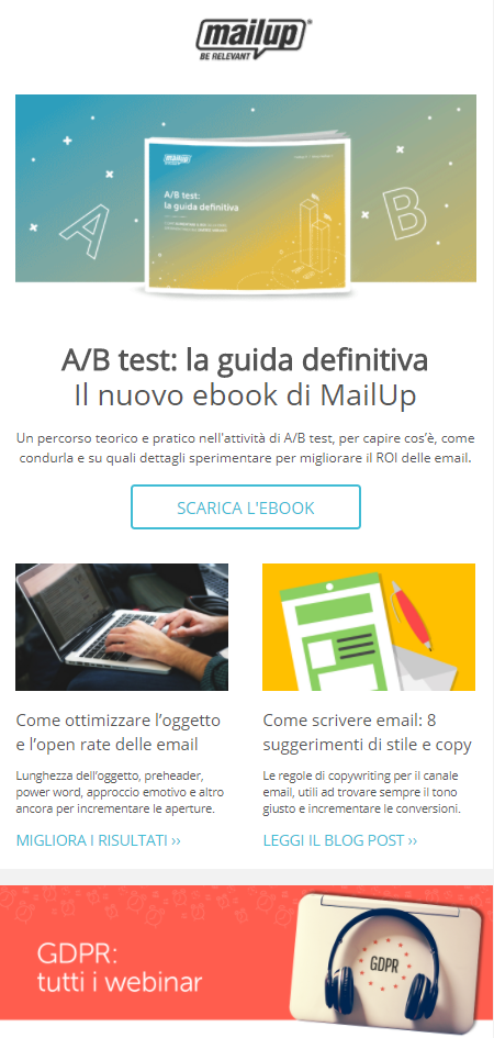 La colonna unica asseconda lo storytelling di un’email, accompagnando i lettori lungo i diversi contenuti del messaggio, giù fino all’invito all’azione, vero e proprio epilogo.