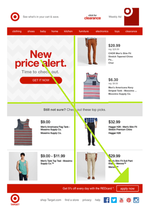 Dal momento che, tendenzialmente, le aree incolte forti e deboli cadono al di fuori della gravità di lettura, si raccomanda ai brand di posizionare gli elementi importanti lungo il percorso di gravità della lettura. Ecco un buon esempio, che pecca solo di scarso risalto della call to action (la zona terminale).
