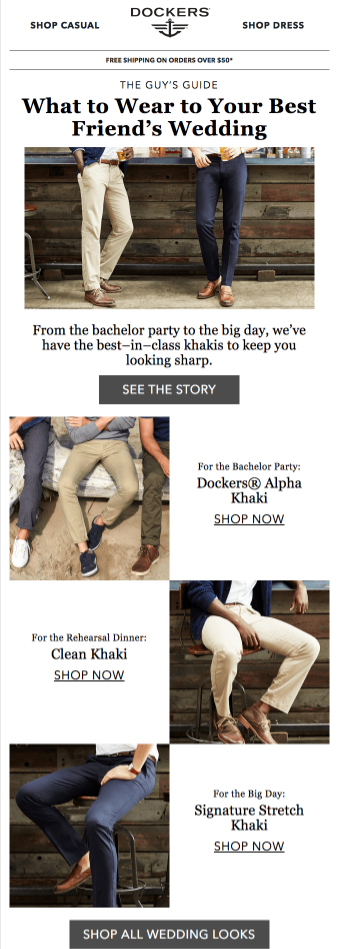 Le email a colonna singola hanno una gerarchia chiara: iniziano con il contenuto più importante, seguito in ordine di rilevanza dai successivi. Un modulo dietro l’altro, senza complicazioni compositive. - Disposizione narrativa