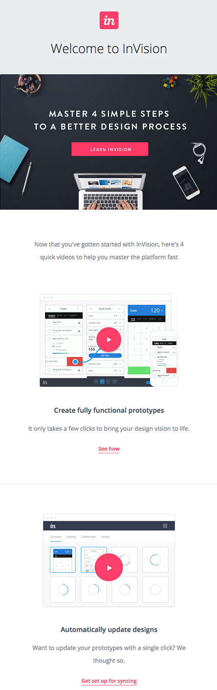Il layout a colonna singola è costituito da uno o più moduli che riempiono l’intera larghezza dell’email e sono tutti impilati uno sopra l’altro. InVision sfrutta al meglio questo genere di disposizione.