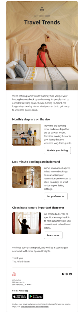 Il design della mail è pulito e organizzato, soprattutto per la scelta di un testo nero su sfondo bianco. I blocchi sono ben separati, ognuno ha un titolo in grassetto e una descrizione semplice ed efficace che punta a soddisfare una diversa esigenza del lettore – aggiornare gli elenchi dei risultati, cambiare le impostazioni di ricerca, approfondire le norme di igiene delle case del network di Airbnb. Le CTA sono esplicite e chiare, contengono solo 2, massimo 3 parole.