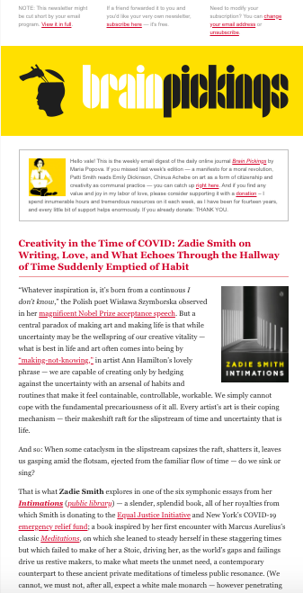 BrainPickings è una delle newsletter più interessanti in circolazione. Ogni domenica mattina gli abbonati ricevono un digest settimanale con i migliori articoli pubblicati su creatività, psicologia, arte, scienza, design e filosofia. È interessante analizzarla perché mostra come gestire una newsletter densissima di contenuti. Ciò che la fa funzionare è una struttura ben equilibrata tra testo e immagini: per abbassare il carico cognitivo richiesto al lettore, Maria non lesina in contenuti visual: foto, disegni e immagini a colori di alta qualità.