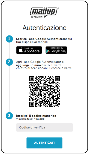 Anche la piattaforma MailUp mette a disposizione dell’utente la possibilità di attivare l’autenticazione a due fattori. Una volta impostata, al momento del primo accesso in piattaforma, sarà richiesto di scansionare il QR code presente nella pagina di login e di inserire un codice di verifica, generato da un’applicazione installata su un dispositivo dell’utente, come mostrato nell’immagine di seguito.