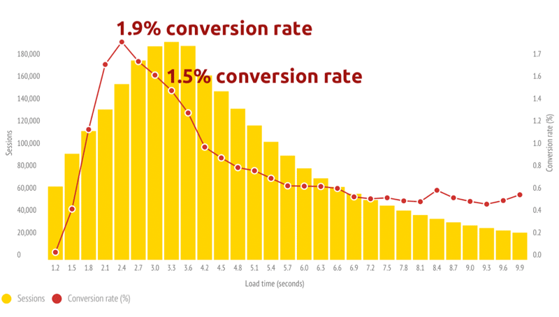 Uno studio di Kinsta, invece, guarda la questione da un’angolazione differente: il 74% degli utenti abbandona le pagine che non si caricano entro 5 secondi; mentre i dati qui sotto, di Soasta, mostrano come le conversioni comincino a crollare già prima dei 2 secondi.