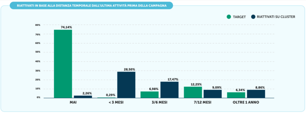 Nel nostro ebook Strategie di re-engagement ti abbiamo già mostrato tutti i dati che lo confermano: recuperare clienti è più efficace quando l’invio viene effettuato con tempismo, senza far passare troppo tempo dall’ultima attività del contatto. Il tasso di riattivazione del cliente raggiunge il 28,5% infatti quando l’invio avviene entro i 3 mesi dall’ultima azione compiuta.