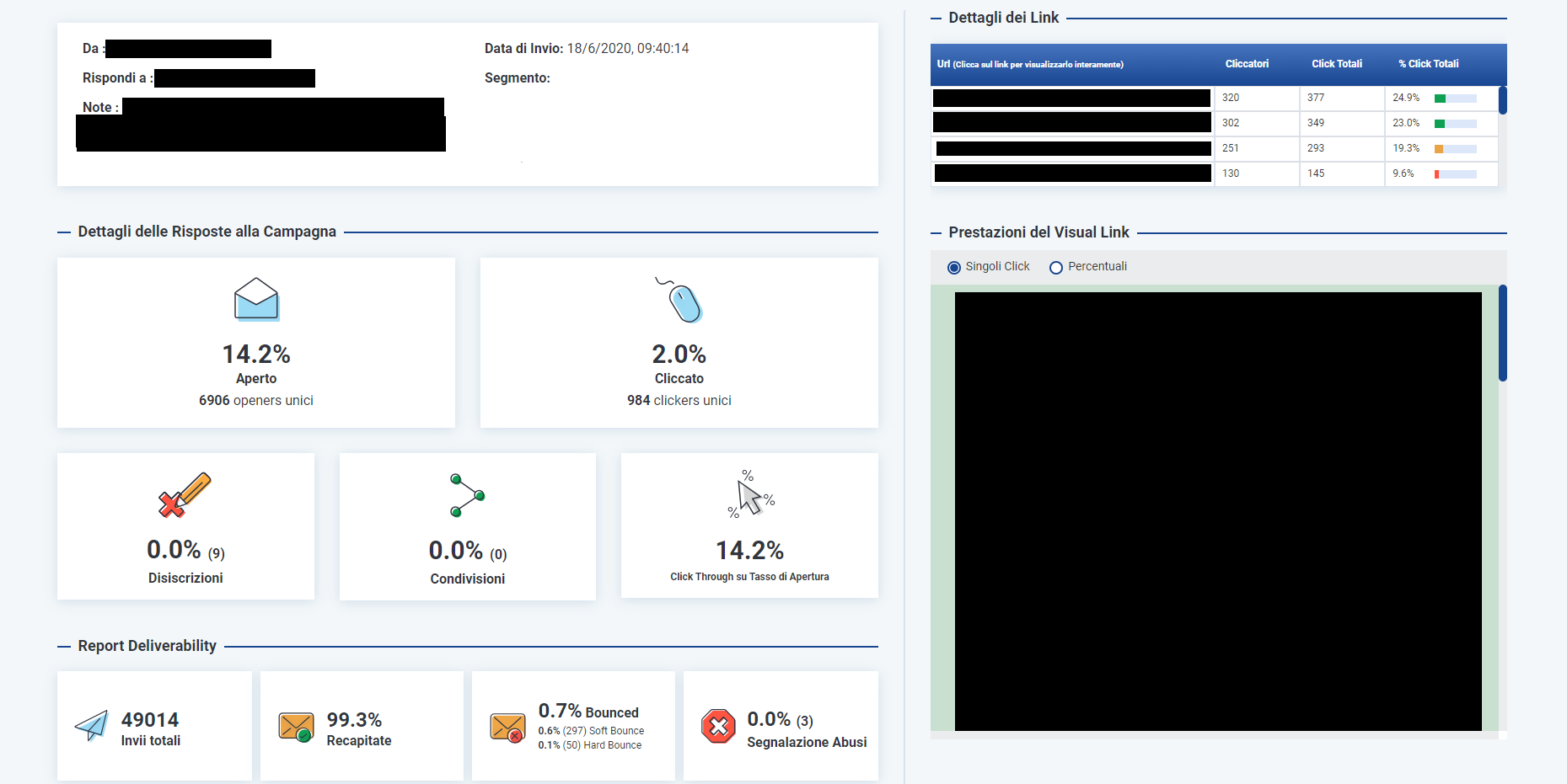 - Dettagli sul link cliccati (numero cliccatori, clic totali, % clic totali) visibili in Report Link