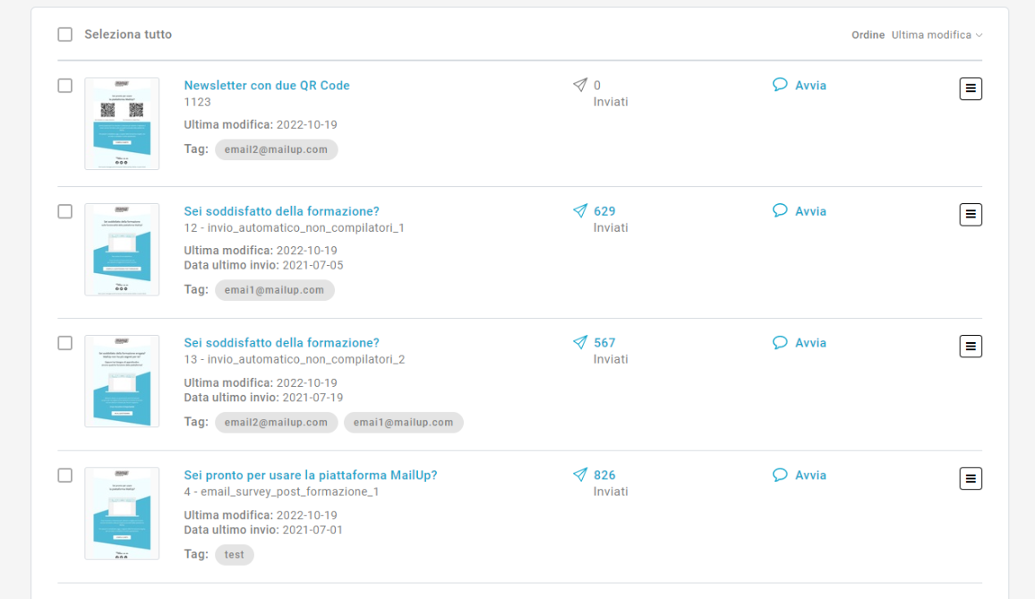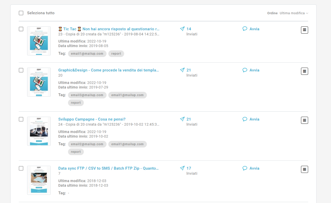 - I report sono per messaggio email: non sono generati report per singolo invio, come in piattaforma MailUp.
